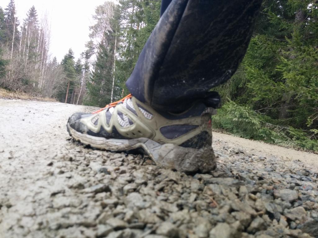 Maastossa pystyy jo juoksemaan, mutta aika kuraista ja märkää se on! Lenkkarit oli ihan märät reilun kahden tunnin lenkin jälkeen. Pitää hommata gore-tex -lenkkarit, mutta ei oikein osaa päättää mimmoiset haluaa. On korkeaa vartta, on kevyttä rakennetta, bare footia – vaikka mitä!